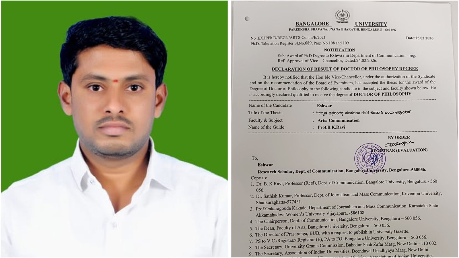 ಬೆಂಗಳೂರು ವಿಶ್ವವಿದ್ಯಾಲಯ ಸಂವಹನ ವಿಭಾಗದ ಹಿರಿಯ ಪ್ರಾಧ್ಯಾಪಕರು ಹಾಗೂ ಪ್ರಸ್ತುತ ಬೆಂಗಳೂರು ಉತ್ತರ ವಿಶ್ವವಿದ್ಯಾಲಯ (ಕೋಲಾರ) ಕುಲಪತಿಗಳಾದ ಪ್ರೊ. ಬಿ.ಕೆ. ರವಿ ಅವರ ಮಾರ್ಗದರ್ಶನದಲ್ಲಿ ಮಂಡಿಸಿದ “ಕನ್ನಡ ಚಿತ್ರರಂಗಕ್ಕೆ ಹಂಸಲೇಖ ರವರ ಕೊಡುಗೆ: ಒಂದು ಅಧ್ಯಯನ” ಎಂಬ ಸಂಶೋಧನಾ ಮಹಾಪ್ರಬಂಧಕ್ಕೆ ಡಾಕ್ಟರೇಟ್ ಪದವಿ ಪ್ರದಾನ ಮಾಡಲಾಗಿದೆ ಎಂದು ಬೆಂಗಳೂರು ವಿಶ್ವವಿದ್ಯಾಲಯವು ಪ್ರಕಟಣೆಯಲ್ಲಿ ತಿಳಿಸಿದೆ.