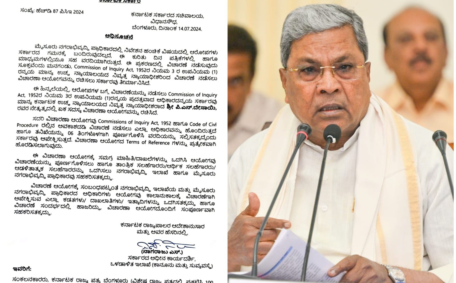 ಬೆಂಗಳೂರು:ಮುಖ್ಯಮಂತ್ರಿ ಸಿದ್ದರಾಮಯ್ಯ ವಿರುದ್ಧವೂ ಆರೋಪ ಕಾಎಳಿಬಂದಿರುವ ಮೂಡಾ ಹಗರಣವನ್ನು ನ್ಯಾಯಾಂಗ ತನಿಖೆಗೆ ಒಳಪಡಿಸಿ ಸರಕಾರ ಆದೇಶ ಹೊರಡಿಸಿದೆ.