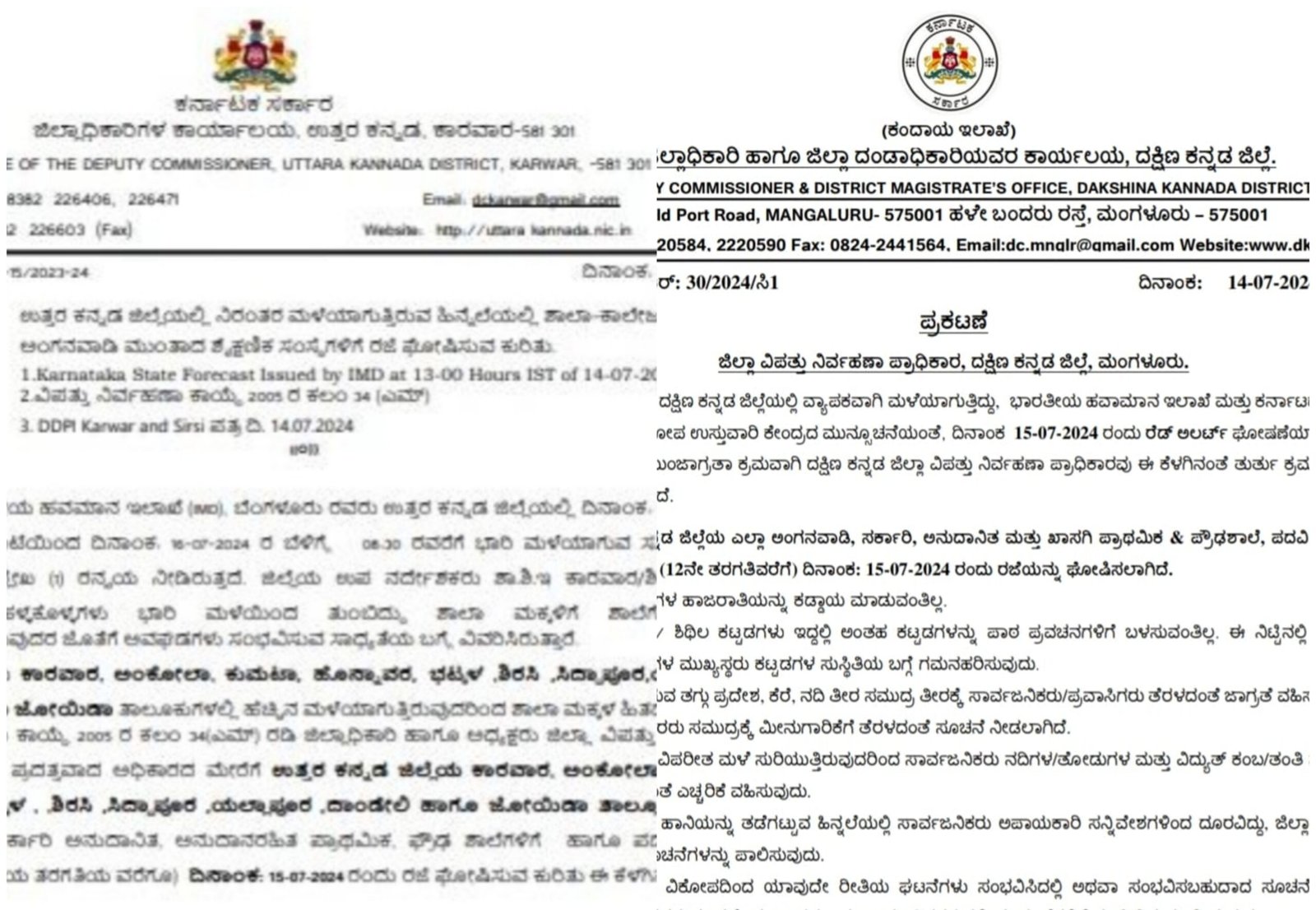 ಜಿಲ್ಲೆಯಲ್ಲಿ ವ್ಯಾಪಕ ಮಳೆ ಸುರಿಯುತ್ತಿರುವುದರಿಂದ, ವಿದ್ಯಾರ್ಥಿಗಳ ಹಿತದೃಷ್ಟಿಯಿಂದ ಕಾರವಾರ ಅಂಕೋಲಾ, ಹೊನ್ನಾವರ, ಕುಮಟಾ, ಭಟ್ಕಳ, ಶಿರಸಿ, ಸಿದ್ದಾಪುರ, ಯಲ್ಲಾಪುರ, ದಾಂಡೇಲಿ ಮತ್ತು ಜೋಯಿಡಾ ತಾಲೂಕಿನ ಎಲ್ಲ ಸರ್ಕಾರಿ, ಸರ್ಕಾರಿ ಅನುದಾನಿತ, ಅನುದಾನ ರಹಿತ ಪ್ರಾಥಮಿಕ, ಪ್ರೌಢ ಶಾಲೆಗಳಿಗೆ ಹಾಗೂ ಪದವಿ ಪೂರ್ವ ಕಾಲೇಜುಗಳಿಗೆ ಸೋಮವಾರ (ಜುಲೈ 15 ರಂದು) ರಜೆ ನೀಡಿ ಉತ್ತರ ಕನ್ನಡ ಜಿಲ್ಲಾಧಿಕಾರಿ ಲಕ್ಷ್ಮೀ ಪ್ರಿಯಾ ಆದೇಶಿಸಿದ್ದಾರೆ.
