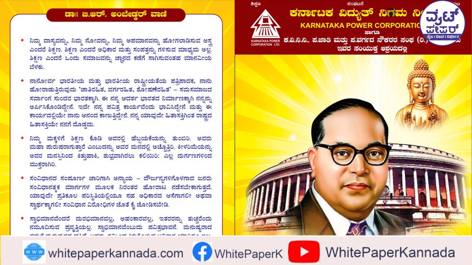 ಬೆಂಗಳೂರು: ಕರ್ನಾಟಕ ವಿದ್ಯುತ್ ನಿಗಮ ನಿಯಮಿತ (ಕೆಪಿಸಿಎಲ್) ಹಾಗೂ ನಿಗಮದ ಪರಿಶಿಷ್ಟ ಜಾತಿ ಮತ್ತು ಪರಿಶಿಷ್ಟ ವರ್ಗದ ನೌಕರರ ಸಂಘದ ಸಹಯೋಗದೊಂದಿಗೆ ಜೂ. 6ರಂದು ಸಂವಿಧಾನ ಶಿಲ್ಪಿ ಭಾರತ ರತ್ನ ಡಾ.ಬಿ.ಆರ್.ಅಂಬೇಡ್ಕರ್ ಅವರ 133ನೇ ಜಯಂತಿ ಹಮ್ಮಿಕೊಳ್ಳಲಾಗಿದೆ.