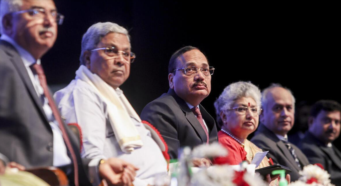 ಮುಖ್ಯಮಂತ್ರಿ ಸಿದ್ದರಾಮಯ್ಯ, ಭಾರತದ ಮುಖ್ಯ ನ್ಯಾಯಮೂರ್ತಿ ಸೂರ್ಯಕಾಂತ್, ಸುಪ್ರೀಂ ಕೋರ್ಟ್ ನ್ಯಾಯಾಧೀಶರುಗಳಾದ ನ್ಯಾಯಮೂರ್ತಿ ಬಿ.ವಿ. ನಾಗರತ್ನ ಮತ್ತು ನ್ಯಾಯಮೂರ್ತಿ ಅರವಿಂದ್ ಕುಮಾರ್, ಕರ್ನಾಟಕದ ಮುಖ್ಯ ನ್ಯಾಯಮೂರ್ತಿ ನ್ಯಾಯಮೂರ್ತಿ ವಿಭು ಬಖ್ರು ಮತ್ತು ಇತರರು ಬೆಂಗಳೂರಿನಲ್ಲಿ ಶನಿವಾರ ನಡೆದ ನ್ಯಾಯಾಂಗ ಅಧಿಕಾರಿಗಳ 22ನೇ ದ್ವೈವಾರ್ಷಿಕ ರಾಜ್ಯ ಮಟ್ಟದ ಸಮ್ಮೇಳನದಲ್ಲಿ.