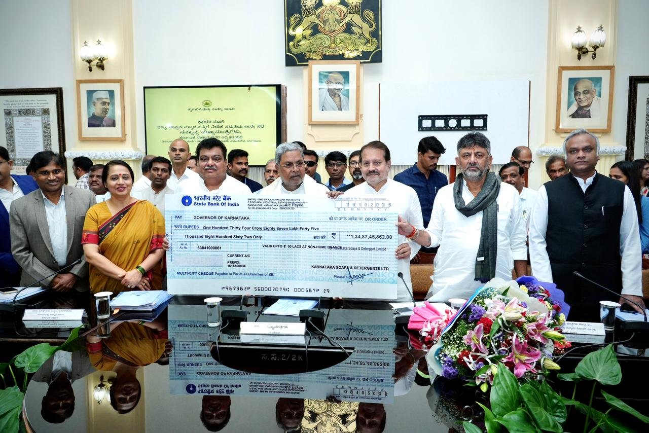ಬೆಂಗಳೂರು: ಸಾರ್ವಜನಿಕ ವಲಯದ ಕರ್ನಾಟಕ ಸಾಬೂನು ಮತ್ತು ಮಾರ್ಜಕ ನಿಯಮಿತವು (ಕೆಎಸ್ಡಿಎಲ್) 2024-25ನೇ ಸಾಲಿನ ಲಾಭದಲ್ಲಿ 135 ಕೋಟಿ ರೂಪಾಯಿಗಳ ಡಿವಿಡೆಂಡ್ ಚೆಕ್ ಅನ್ನು ಶುಕ್ರವಾರ ಸರಕಾರಕ್ಕೆ ಹಸ್ತಾಂತರಿಸಿತು.