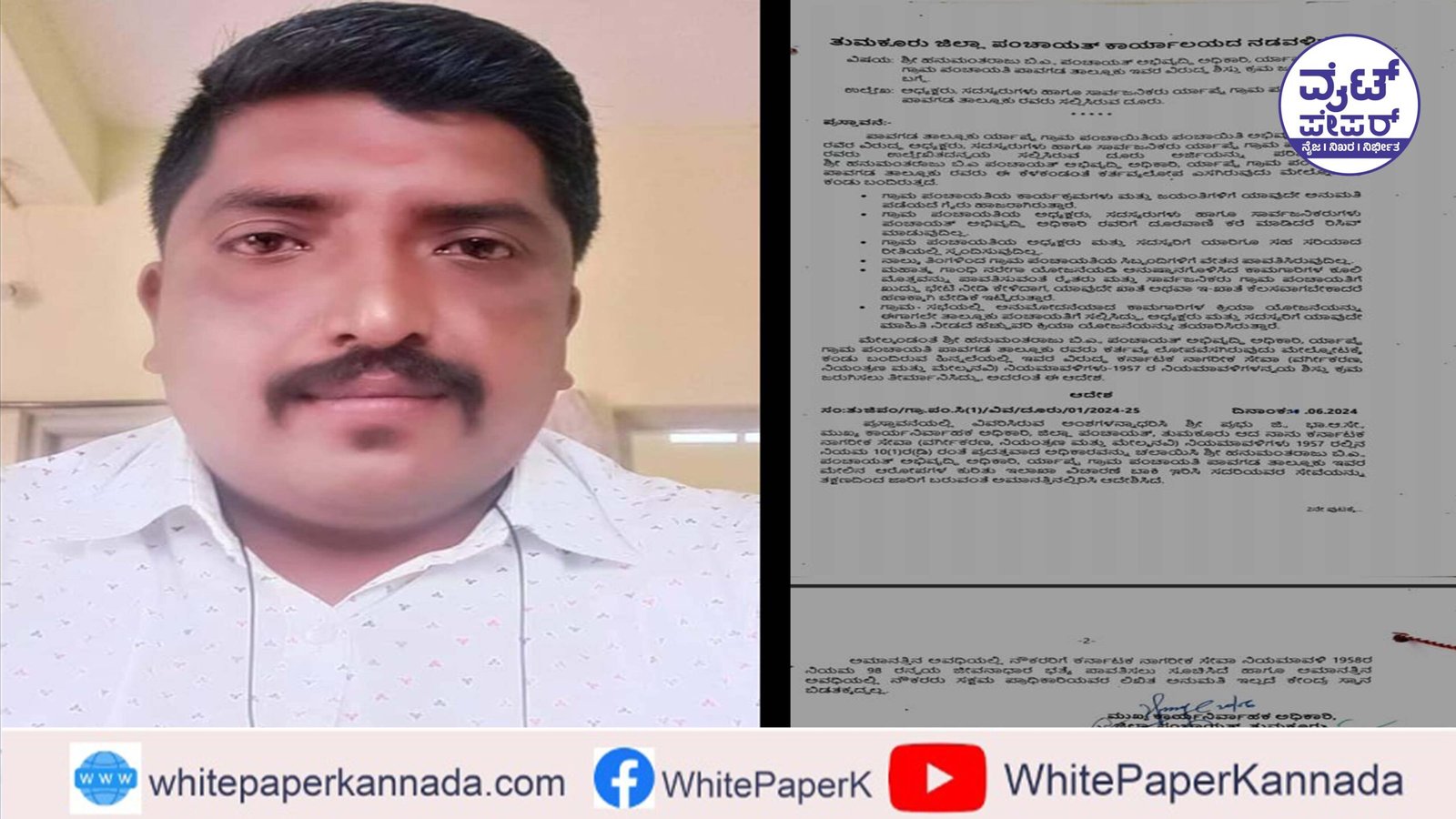 ಮತ್ತಿತರ ಅಂಶಗಳ ಆಧಾರದ ಮೇಲೆ ಪಾವಗಡ ತಾಲೂಕು ಕಾರ್ಯ ನಿರ್ವಾಣಾಕಾರಿಯಾದ ಜಾನಕಿ ರಾಮ ರವರ ಶಿಫಾರಸ್ ಮೇರೆಗೆ ಜಿಲ್ಲಾ ಪಂಚಾಯಿತಿ ಸಿ.ಇ.ಒ. ಜಿ.ಪ್ರಭು ರವರು ಜೂನ್ 21ರಂದು ಅಮಾನತು ಮಾಡಿ ಆದೇಶಿಸಿದ್ದಾರೆ.