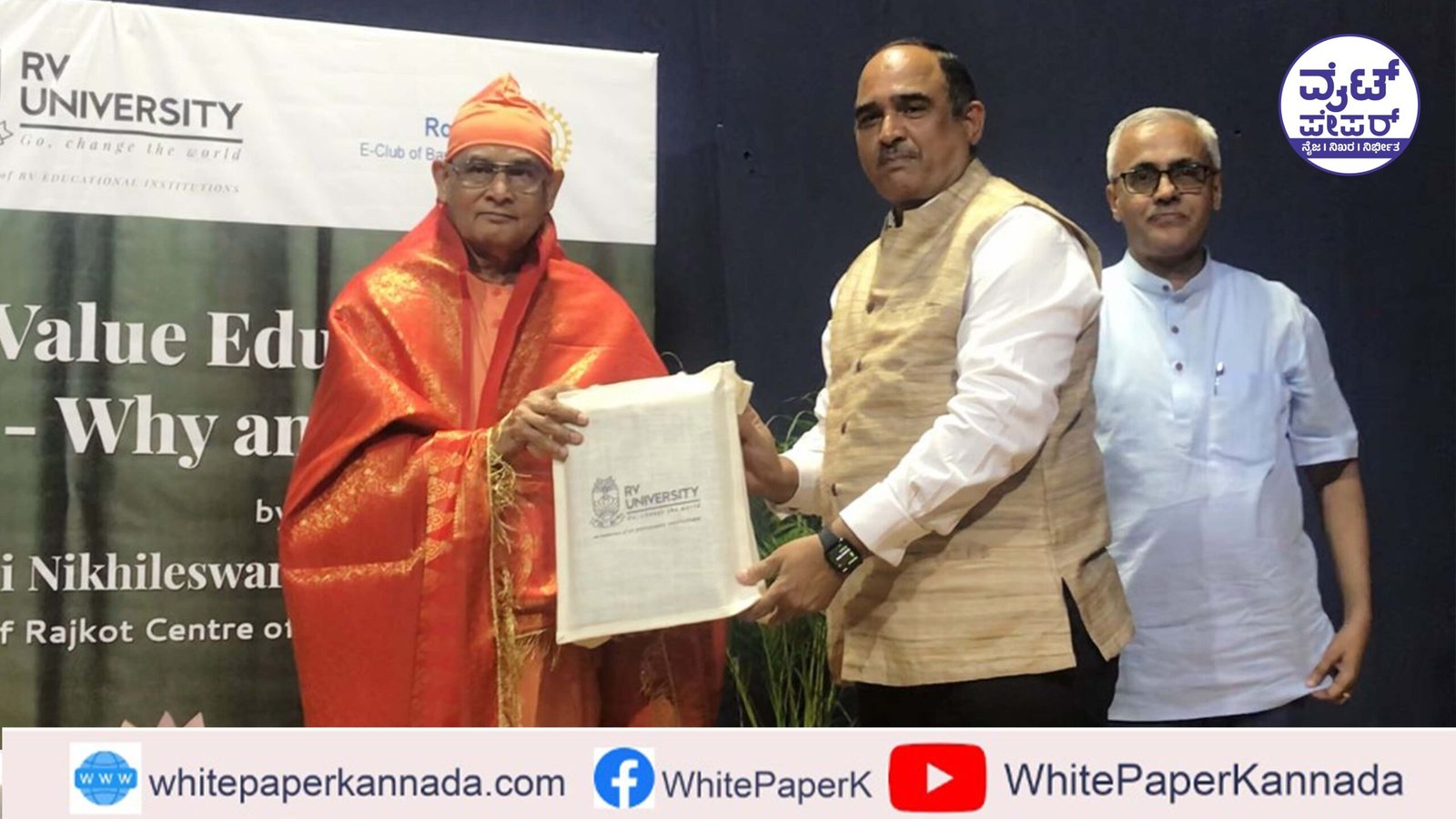 ಬೆಂಗಳೂರು: ಆರ್‌ವಿ ವಿಶ್ವವಿದ್ಯಾಲಯವು ಶುಕ್ರವಾರ ಆಯೋಜಿಸಿದ್ದ ಕಾರ್ಯಕ್ರಮದಲ್ಲಿ ‘ಮೌಲ್ಯ ಶಿಕ್ಷಣ- ಯಾಕೆ ಮತ್ತು ಹೇಗೆ?’ ವಿಷಯದ ಕುರಿತು ರಾಮಕೃಷ್ಣ ಮಿಷನ್‌ನ ರಾಜ್‌ಕೋಟ್ ಕೇಂದ್ರದ ಮುಖ್ಯಸ್ಥ ಸ್ವಾಮಿ ನಿಖಿಲೇಶ್ವರಾನಂದಜಿ ಮಹಾರಾಜ್ ಉಪನ್ಯಾಸ ನೀಡಿದರು. ಸಮಕಾಲೀನ ಸಮಾಜದ ಸವಾಲುಗಳನ್ನು ಎದುರಿಸಲು ಮತ್ತು ಶ್ರೇಷ್ಠ ವ್ಯಕ್ತಿತ್ವಗಳನ್ನು ಬೆಳೆಸಲು ಬೌದ್ಧಿಕ, ಭಾವನಾತ್ಮಕ ಮತ್ತು ಅಧ್ಯಾತ್ಮಿಕ ಬೆಳವಣಿಗೆಯನ್ನು ಒಟ್ಟುಗೂಡಿಸಿದ ಸಮಗ್ರ ಶಿಕ್ಷಣ ವಿಧಾನದ ತುರ್ತು ಅಗತ್ಯವನ್ನು ಅವರು ತಮ್ಮ ಉಪನ್ಯಾಸದಲ್ಲಿ ಪ್ರತಿಪಾದಿಸಿದರು.
